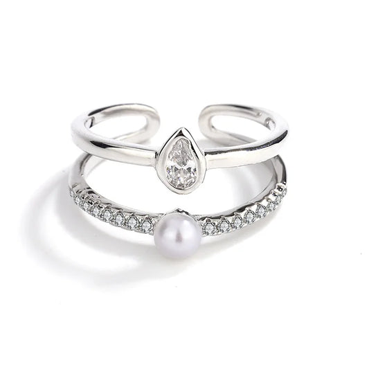 Custom fine jewelry simple double ring claw-set zircon diamond freshwater pearl silver ring