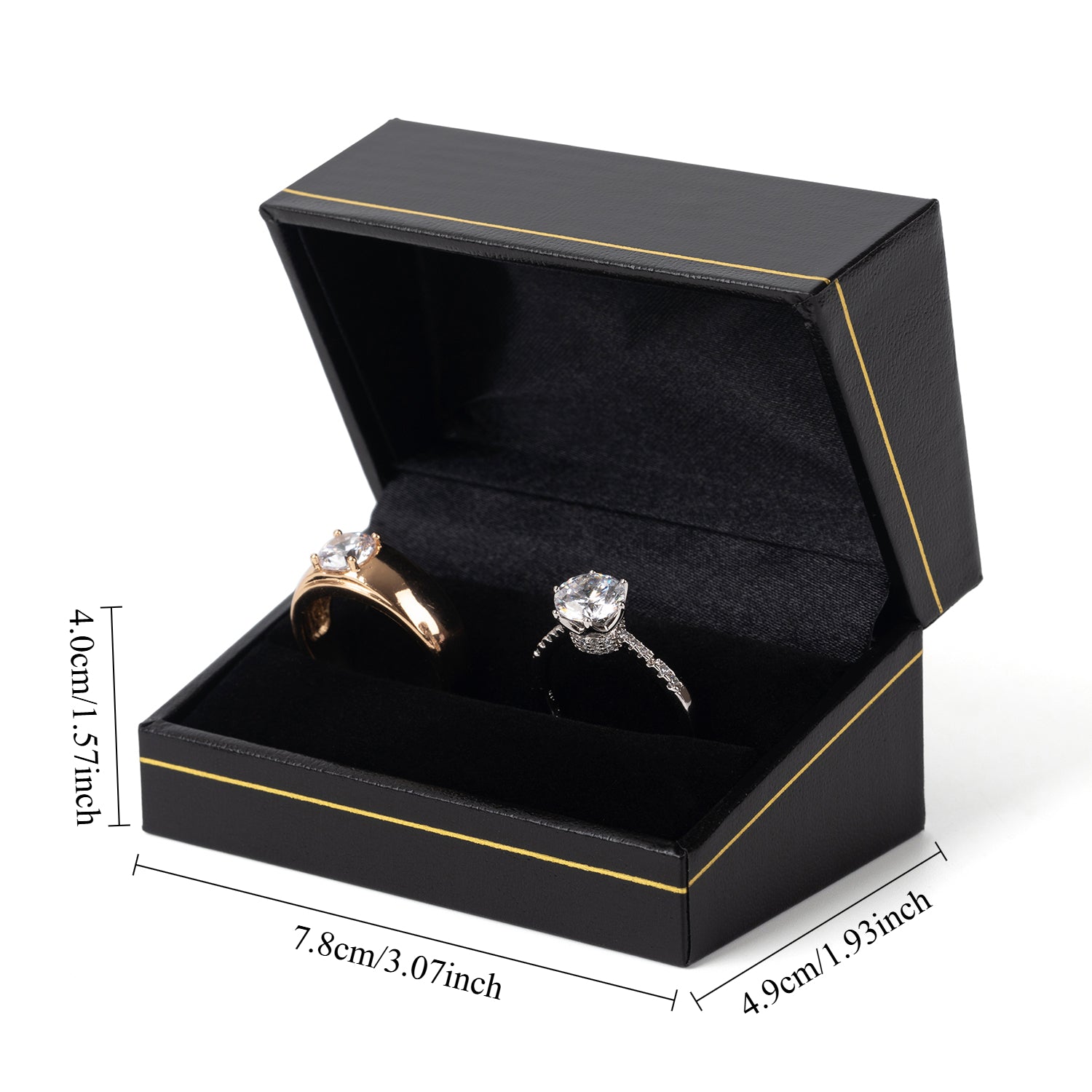 • Nota: Esta caja para anillos doble está disponible en stock en California y es personalizable. Se puede personalizar el color, el logotipo y el color interior. La cantidad mínima de pedido es de 1000 piezas.