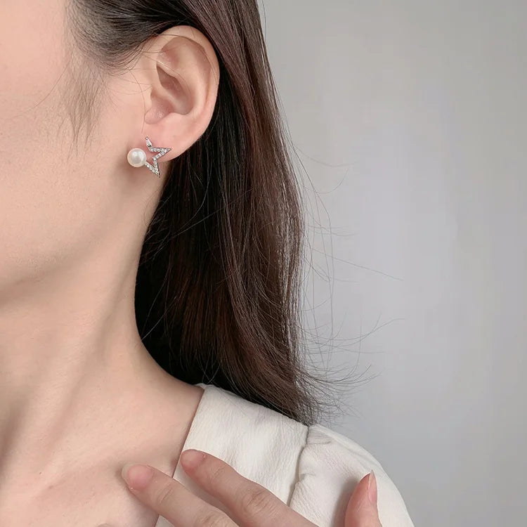 Fashion women jewelry earrings pentagram exquisite star silver pearl stud earrings