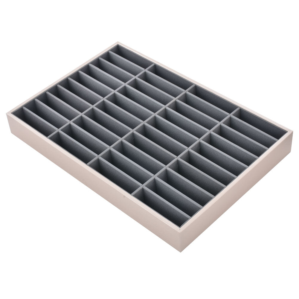 Esta serie de bandejas para exhibir joyas está diseñada y fabricada con materiales de PU y viene en dos combinaciones de colores: interior negro con exterior negro e interior blanco con exterior negro. Estas bandejas son perfectas para exhibir joyas de plata, oro y varios colores, ofreciendo un efecto natural y elegante a la vez que son fáciles de almacenar. La línea de productos incluye bandejas para anillos, bandejas para pulseras, bandejas para colgantes, bandejas para aretes, bandejas para pulseras y bandejas para collares.