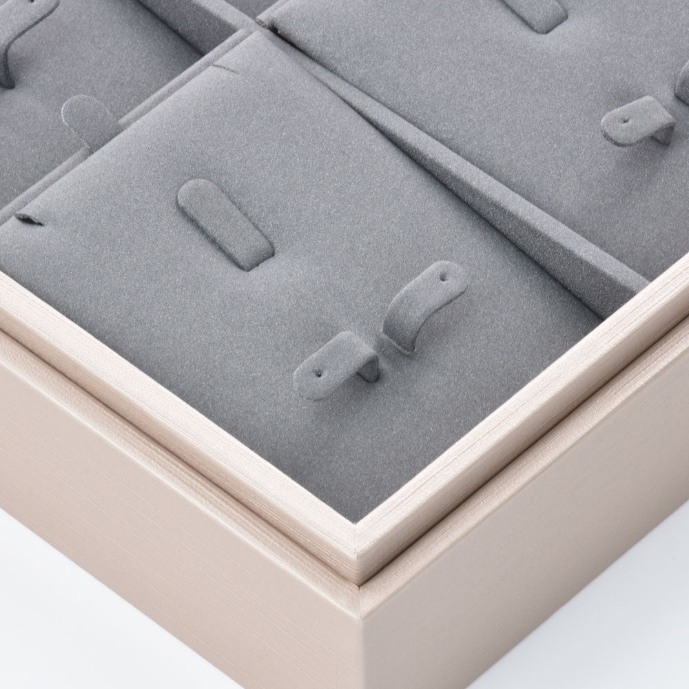 Esta serie de bandejas para exhibir joyas está diseñada y fabricada con materiales de PU y viene en dos combinaciones de colores: interior negro con exterior negro e interior blanco con exterior negro. Estas bandejas son perfectas para exhibir joyas de plata, oro y varios colores, ofreciendo un efecto natural y elegante a la vez que son fáciles de almacenar. La línea de productos incluye bandejas para anillos, bandejas para pulseras, bandejas para colgantes, bandejas para aretes, bandejas para pulseras y bandejas para collares.