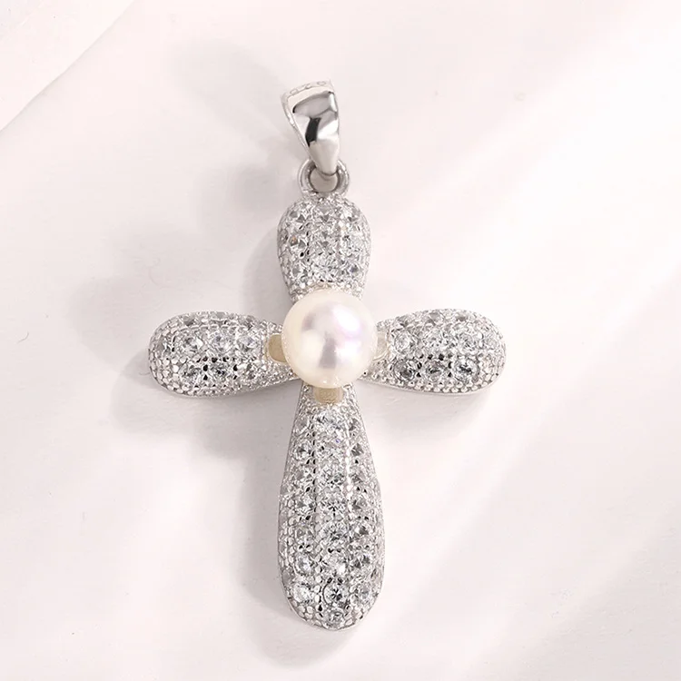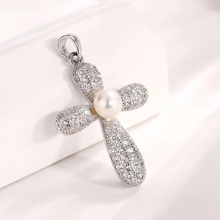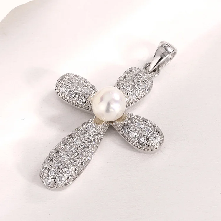 Women sterling silver moissanite diamond crucifix cross pendant with freshwater pearl