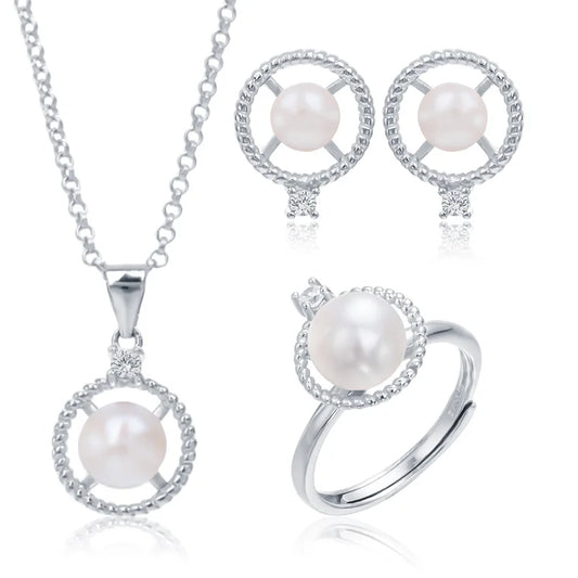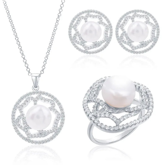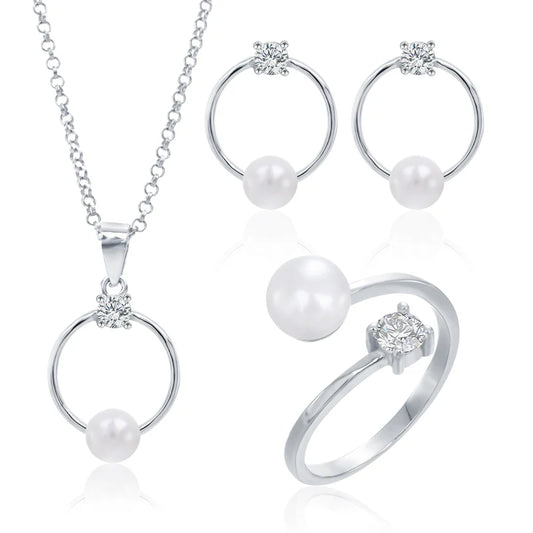 Fashion fine jewelry sets silver pearl ring earrings and pendant necklace set